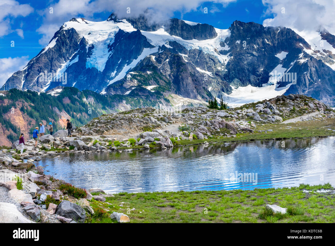 Hikers Mount Shuksan Pool Reflection Summer Artist Point Mount Baker Highway Pacific Northwest Washington State Snow Mountain Grass Trees Stock Photo Alamy